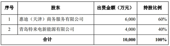 合資公司注冊資本為人民幣1億元,出資方式均為貨幣,其中惠迪出資額為人民幣6000萬元,占注冊資本的 60%;特來電出資額為人民幣4000萬元,占注冊資本的 40%。