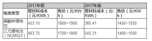 2017年底較年初,磷酸鐵鋰電池原材料成本從453.15元/KWh下降到了385.41元/KWh,降幅近15%;三元鋰電池原材料成本從463.75元/KWh上漲到了545.31元/KWh,漲幅達(dá)17.6%。