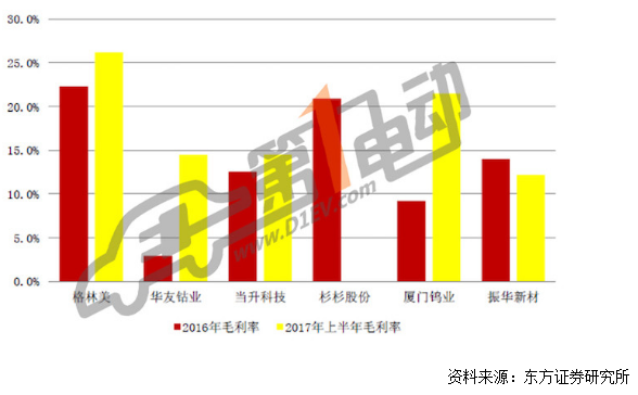 而從整個(gè)產(chǎn)業(yè)鏈角度看,一方面上游資源漲價(jià)階段,議價(jià)能力極強(qiáng),且盈利情況非常好;同時(shí)下游電芯企業(yè)競(jìng)爭(zhēng)激烈,降價(jià)壓力巨大;因此中游正極廠商將面臨成本上升、銷售價(jià)格承壓的雙重壓力,整體盈利困難,東風(fēng)證券研究所的研究結(jié)果顯示,2017 年各正極公司毛利率水平均處于較低水平。業(yè)內(nèi)平均毛利率為10~20%左右。擁有上游資源優(yōu)勢(shì)的公司如格林美的毛利率可達(dá)20%以上。