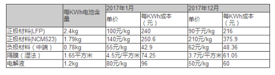 2017年動(dòng)力電池原材料成本變化