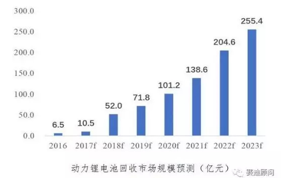 賽迪顧問的數(shù)據(jù)顯示,預(yù)計2020年退役的鋰電池約50GWh,綜合考慮三元材料、磷酸鐵鋰及鈷酸鋰回收價值,2020年相關(guān)市場空間可達(dá)百億級別。