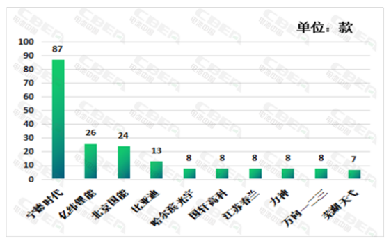 從整體配套電池企業(yè)來看,本批推薦目錄配套電池企業(yè)多達60多家。其中,排名前10的電池企業(yè)配套車型款數(shù)之和占本批推薦目錄總車型款數(shù)的64.8%。排名靠前的寧德時代、億緯鋰能、北京國能、比亞迪配套車型款數(shù)均在10款以上,分別配套87款、26款、24款和13款。