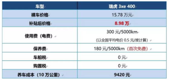 今年以來,新能源汽車銷量節(jié)節(jié)攀高。近日,奇瑞瑞虎3XE400及小螞蟻300聯(lián)動齊發(fā),在上海正式上市,瑞虎3XE400最高續(xù)航445KM,0-50KM/h加速4S內(nèi),煥新小螞蟻300更是完成了23項優(yōu)化升級,60KM/h等速情況下續(xù)航里程達到310公里,再次樹立了同級電動汽車行業(yè)標(biāo)桿。兩款產(chǎn)品憑借各自卓越性能以及突出的性價比,吸引無數(shù)目光。下表為瑞虎3XE400使用成本表現(xiàn)。