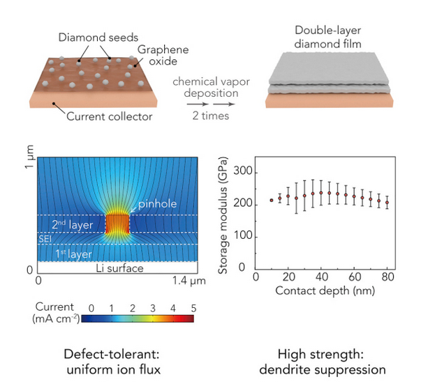 納米金剛石薄膜不僅具有優(yōu)異的電化穩(wěn)定性,而且具有抑制鋰枝晶的極高模量。由于表面保護(hù)層的針孔會(huì)破壞離子流量的均勻性,斯坦福研究人員開(kāi)發(fā)出了獨(dú)特的雙層結(jié)構(gòu)來(lái)彌補(bǔ)設(shè)計(jì)缺陷,也就是,一層中的缺陷可通過(guò)另一完整層來(lái)篩誤。