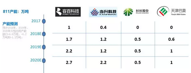 目前國內(nèi)主流三元廠家容百、當(dāng)升、杉杉、巴莫的數(shù)據(jù)調(diào)研顯示,2018~2019預(yù)計出產(chǎn)能4萬噸左右,遠低于目前NCM523,NCM622等產(chǎn)能釋放,預(yù)計到2020年才可達到6.4萬噸的產(chǎn)能,材料供應(yīng)商對此反應(yīng)比較謹慎,產(chǎn)能釋放較為緩慢。