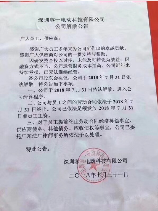 根據(jù)容一電動(dòng)公告稱,因公司研發(fā)資金投入過多,未能及時(shí)轉(zhuǎn)化為效益,以及融資方式的不對(duì),運(yùn)營財(cái)務(wù)成本過高,導(dǎo)致近年來持續(xù)虧損,已經(jīng)無法繼續(xù)經(jīng)營。根據(jù)公司股東會(huì)議決定,公司于2018年7月31日依法解散!