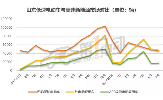 從與純電動乘用車銷量的對比圖中可以看出,從2017年1月至2018年3月,山東省低速電動車產(chǎn)量與純電動乘用車銷量走勢基本一致。但是在2018年5月,純電動乘用車市場,尤其是A00級純電動車市場出現(xiàn)脈沖式增長,原因在于新政補(bǔ)貼過渡期的最后一個月,不符合新政標(biāo)準(zhǔn)的眾多A00級純電動車集體沖量,而低速電動車在4月和5月的產(chǎn)量相比往年同期下降幅度加大。同時,純電動乘用車銷量數(shù)據(jù)在5月首次超過山東低速電動車產(chǎn)量數(shù)據(jù)。5月以來,雖然純電動乘用車產(chǎn)量也在下滑,但總量依然超過低速電動車產(chǎn)量。7月來看,純電動乘用車產(chǎn)量47538輛,高出低速電動車1385輛,擴(kuò)大了6月的優(yōu)勢。