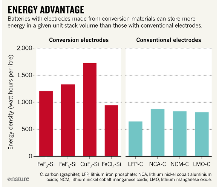 在我們看來,最有希望的替代方法是在電極中使用轉(zhuǎn)換材料。銅、鐵、氟化物和硅與鋰離子發(fā)生反應(yīng)。轉(zhuǎn)換陰極中的過渡金屬可以容納比標(biāo)準(zhǔn)陰極多6倍的鋰原子。這種材料膨脹得更多,能夠容納更多的鋰原子。