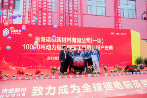 8月30日上午,諾德投資股份有限公司(以下簡稱諾德股份)旗下全資子公司青海諾德新材料有限公司(以下簡稱青海諾德)(一期)10000噸動力鋰電銅箔工程項目投產(chǎn)慶典在青海諾德一期廠房北側(cè)盛大舉辦。