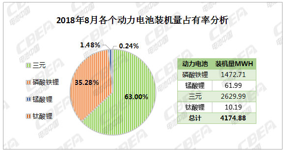 從不同電池類型來看,4.17Gwh裝機總量中,三元動力電池裝機量為2.63Gwh,占比63%;磷酸鐵鋰動力電池裝機量為1.47Gwh,占比35.28%;錳酸鋰動力電池裝機量為0.06Gwh,占比1.48%;鈦酸鋰動力電池裝機量為0.01Gwh,占比0.24%。