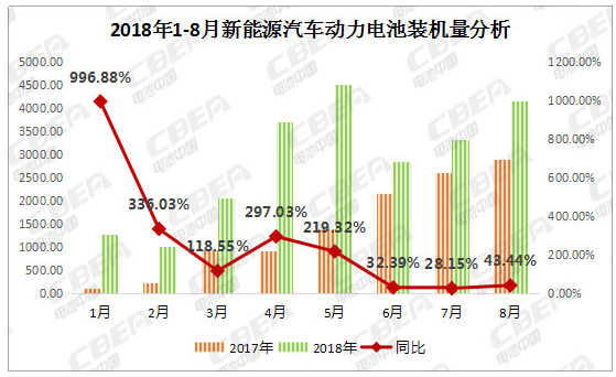 動力電池應用分會研究部分析數(shù)據(jù)顯示,2018年8月,我國新能源汽車動力電池裝機量約4.17Gwh,環(huán)比增長24.9%,同比增長43.44%;1-8月累計裝機總量約22.97Gwh。