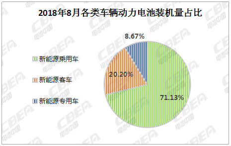 從車輛細分類別來看,2018年8月,我國新能源乘用車動力電池裝機量約2.97Gwh,環(huán)比增長26.27%;新能源客車動力電池裝機量約0.84Gwh,環(huán)比增長40.59%;新能源專用車動力電池裝機量約0.36Gwh,環(huán)比下降7.39%。