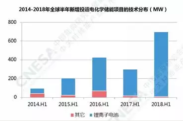 近日, 中關(guān)村儲能產(chǎn)業(yè)技術(shù)聯(lián)盟發(fā)布了2018年上半年儲能行業(yè)發(fā)展回顧。根據(jù)裝機(jī)規(guī)模統(tǒng)計,上半年全球電化學(xué)儲能項目裝機(jī)規(guī)模達(dá)到了697.1MW,同比增長達(dá)到133%,其中,中國電化學(xué)儲能項目裝機(jī)規(guī)模100.4MW,同比增長127%。