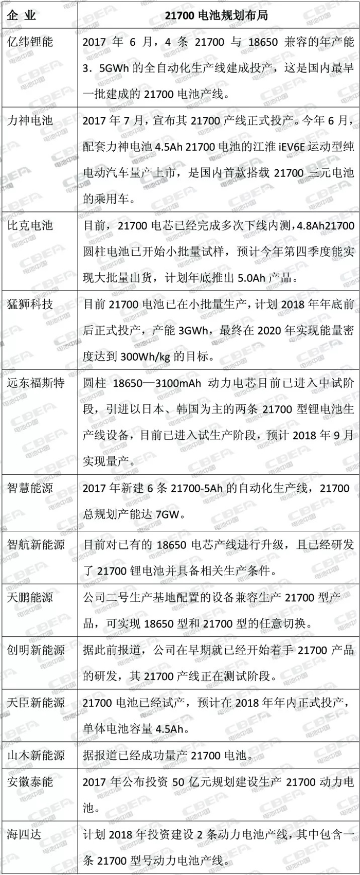 其實在特斯拉影響下,國內(nèi)電池企業(yè)早就開始了對21700電池的布局。因為按照中國政府規(guī)劃,在2020年動力電池單體能量密度突破300Wh/kg,動力電池系統(tǒng)能量密度達(dá)到260Wh/kg;2025年動力電池系統(tǒng)能量密度要達(dá)到350Wh/kg,而目前21700電池正是可以達(dá)到國家能量密度規(guī)劃要求的一大“利器”。電池中國網(wǎng)梳理了目前國內(nèi)電池企業(yè)21700電池的布局狀況: