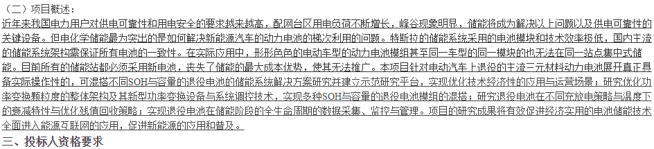 招標(biāo): 云南電網(wǎng)有限責(zé)任公司麗江供電局梯次利用退役動(dòng)力鋰電池的儲(chǔ)能系統(tǒng)新技術(shù)研究科技項(xiàng)目招標(biāo)公告