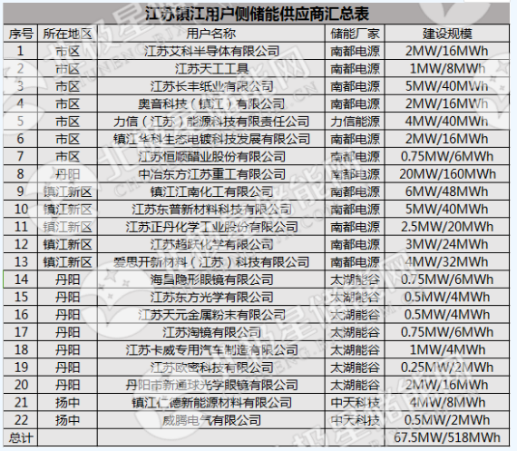 事實上,除了上述兩大市場外,江蘇省用戶側(cè)儲能市場這一特征更加明顯,據(jù)國網(wǎng)江蘇電科院高級工程師史明明介紹,江蘇省內(nèi)用戶側(cè)儲能主要供應商為南都電源、太湖能谷、中天科技、力信能源,庫博能源。據(jù)統(tǒng)計,這5家企業(yè)儲能規(guī)模占全省用戶側(cè)儲能裝機容量的90%以上。下圖為江蘇鎮(zhèn)江用戶側(cè)儲能項目表。