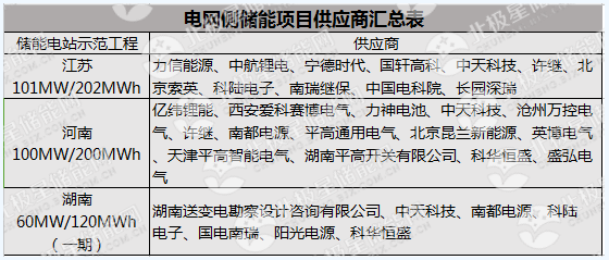 從目前已經(jīng)完成招標的電網(wǎng)側(cè)儲能項目來看,供應商大多集中在少數(shù)幾家企業(yè)手里,具體如下圖所示: