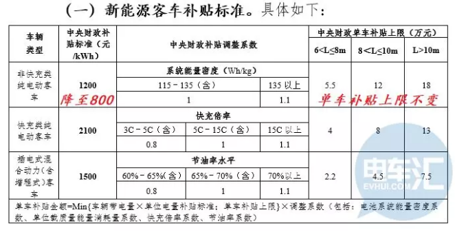 客車方面,每度電補貼標準從1200/kwh降至800元/kwh,單車補貼上限不變,即10米以上車型最高獲補18萬元,8-10米車型最高獲補12萬元,6-8米車型最高獲補5.5萬元。