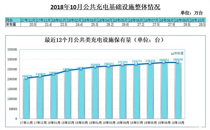 根據中國電動汽車充電基礎設施促進聯盟(簡稱:充電聯盟)的數據統計,2018年10月,聯盟內成員單位總計上報公共類充電樁28.5萬臺,其中交流充電樁18.3萬臺、直流充電樁10.1萬臺、交直流一體充電樁0.1萬臺。2018年10月較2018年9月公共類充電樁減少14臺,這是自公開充電樁數據以來的首次下滑。