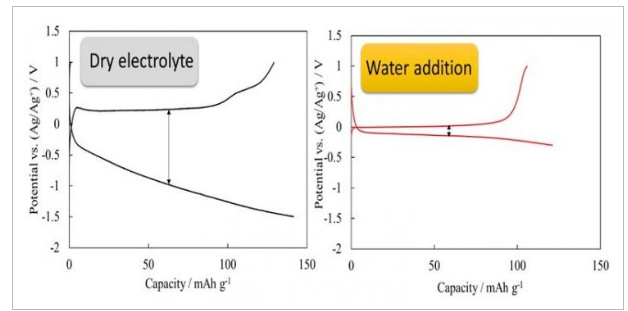 我們發(fā)現(xiàn)加水大大減少了充電/放電之間的電壓差(過(guò)電壓)