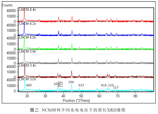 從圖二圖三可以看出,隨著充電電壓的升高,正極材料NCM的(003)峰開始向低角度偏移,此時NCM的(003)晶面間距增大,即c軸變大,當(dāng)電壓達(dá)到4.0V時達(dá)到最低值,隨后隨電壓升高又向高角度偏移;與之相對應(yīng),(110)峰隨電壓升高向高角度偏移,中間沒有反彈趨勢,說明(110)晶面間距減小,對應(yīng)著a軸一直變小。當(dāng)電壓大于4.4V后,003峰峰強(qiáng)變低,并開始寬化,說明此時晶體結(jié)構(gòu)開始嚴(yán)重變形,晶胞中原子不能很好的規(guī)整排列,達(dá)到材料極限承受電壓。