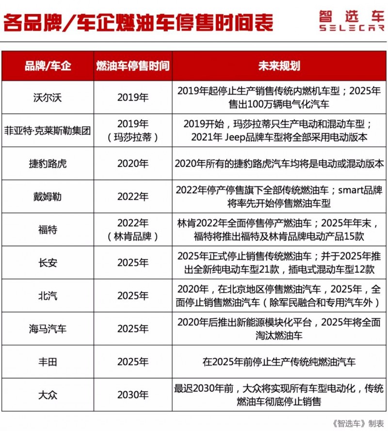 從目前小智整理的信息來看,已經(jīng)有10家車企明確公布了停售燃油車的時間表,除了主流的大眾、豐田、福特、沃爾沃等車企外,自主品牌包括長安、北汽和海馬汽車也明確了停售燃油車的時間。