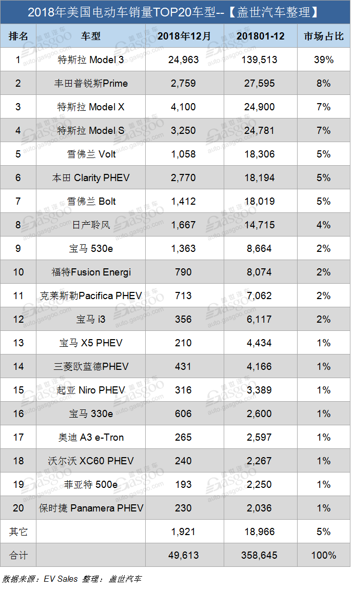 根據(jù)EV Sales網(wǎng)站公布的美國電動車銷量數(shù)據(jù),2018年,美國電動車累銷達358,645輛,較2017年激增80%。而這主要歸功于特斯拉Model 3的交付量。去年12月份,特斯拉Model 3銷量再創(chuàng)新紀錄,達到近25,000輛;2018年,Model 3在美國市場累銷達139,513輛,占據(jù)39%的市場份額,因此成為美國最暢銷電動車。
