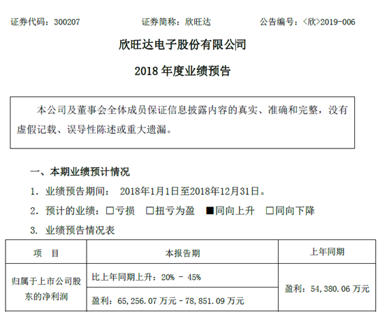 1月7日,欣旺達電子股份有限公司發(fā)布2018年業(yè)績預告。欣旺達預計2018年歸屬于上市公司股東的凈利潤為65,256.07萬元–78,851.09萬元,比2017年同期上升20% - 45%。
