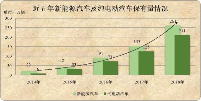 其中,純電動(dòng)汽車保有量211萬輛,占新能源汽車總量的81.06%。從統(tǒng)計(jì)情況看,近五年新能源汽車保有量年均增加50萬輛,呈加快增長趨勢(shì)。