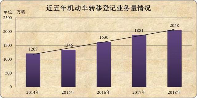 2018年,汽車轉(zhuǎn)移登記業(yè)務(wù)量持續(xù)增長,二手車交易市場日益活躍。2018年,全國共辦理機(jī)動(dòng)車轉(zhuǎn)移登記2128萬筆,其中汽車轉(zhuǎn)移登記2058萬筆,占96.72%,比2017年增加177萬筆,增長9.44%。從統(tǒng)計(jì)情況看,近五年汽車轉(zhuǎn)移登記與注冊(cè)登記業(yè)務(wù)量的比例由0.55上升至0.77,反映出二手車交易市場日益活躍。