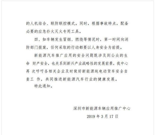 3月17日,深圳新能源推廣中心發(fā)布一則《關(guān)于加強(qiáng)新能源純電動(dòng)貨車(chē)運(yùn)營(yíng)安全的緊急通知》(以下簡(jiǎn)稱(chēng)“通知”),“通知”表示,近期深圳市發(fā)生了多起新能源純電動(dòng)貨車(chē)充電和運(yùn)營(yíng)過(guò)程中的電池?zé)崾Э厥鹿?,為保障人民群眾生命和?cái)產(chǎn)安全,預(yù)防和減少此類(lèi)事故發(fā)生,深圳新能源推廣中心對(duì)車(chē)輛生產(chǎn)企業(yè)和在深圳從事車(chē)輛運(yùn)營(yíng)、充電樁運(yùn)營(yíng)的企業(yè)提出以下建議: