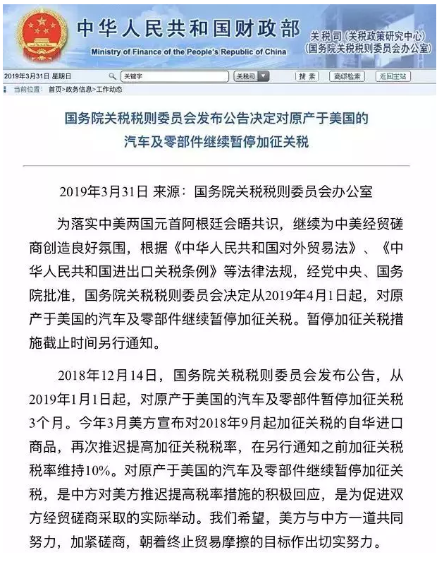 為落實中美兩國元首阿根廷會晤共識,繼續(xù)為中美經(jīng)貿(mào)磋商創(chuàng)造良好氛圍,根據(jù)《中華人民共和國對外貿(mào)易法》、《中華人民共和國進出口關(guān)稅條例》等法律法規(guī),經(jīng)黨中央、國務(wù)院批準,國務(wù)院關(guān)稅稅則委員會決定從2019年4月1日起,對原產(chǎn)于美國的汽車及零部件繼續(xù)暫停加征關(guān)稅。暫停加征關(guān)稅措施截止時間另行通知。