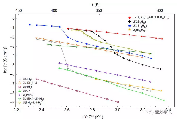 Figure 3. 0.7Li(CB9H10)-0.3Li(CB11H12)和其他復(fù)合氫化物的鋰離子導(dǎo)體的阿倫尼烏斯電導(dǎo)率,0.7Li(CB9H10)-0.3Li(CB11H12)在25℃時(shí)具有6.7×10-3 S/cm的高鋰離子電導(dǎo)率,這是復(fù)合氫化物的最高值。