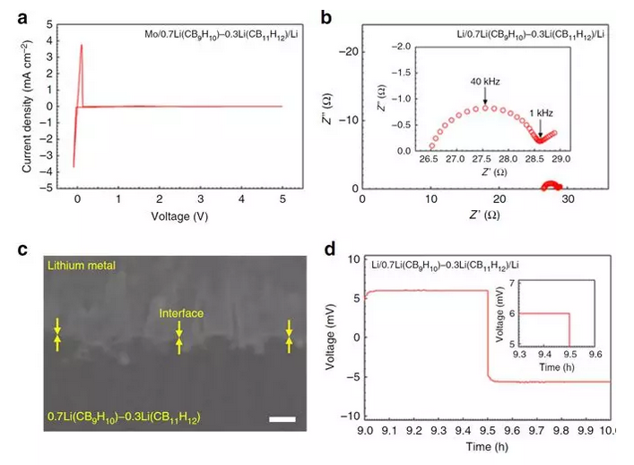 進(jìn)一步使用對(duì)稱電池Li/ 0.7Li(CB9H10)-0.3Li(CB11H12)/Li進(jìn)行EIS測(cè)量,來(lái)研究與鋰金屬負(fù)極之間的界面電阻,SEM圖像證實(shí)了界面處的緊密物理接觸,界面相容性歸因于其高化學(xué)穩(wěn)定性和高物理可變形性。