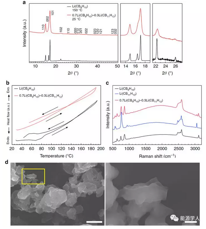 Figure 1. 在室溫下穩(wěn)定高溫相。a)Li(CB9H10)在150℃和0.7Li(CB9H10)-0.3Li(CB11H12)在室溫下的 XRD圖譜;b)Li(CB9H10)和0.7Li(CB9H10)-0.3Li(CB11H12)的差熱分析(DTA)曲線;c)Li(CB9H10),Li(CB11H12)和0.7Li(CB9H10)-0.3Li(CB11H12)的拉曼光譜;d)0.7Li(CB9H10)-0.3Li(CB11H12)的場(chǎng)發(fā)射SEM圖像,放大的圖像(右)是黃色標(biāo)記區(qū)域(左),刻度條d,左圖像為20μm,右圖像3μm。
