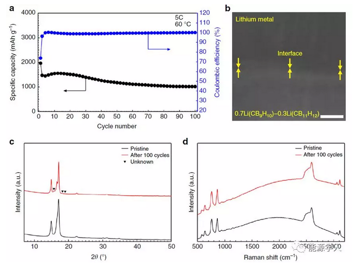 Figure 6. 0.7Li(CB9H10)-0.3Li(CB11H12)在長(zhǎng)時(shí)間循環(huán)中的穩(wěn)定性。a)在50℃條件下,以放電5C和充電1C的倍率循環(huán),放電容量和庫(kù)侖效率的循環(huán)性能;b)100次循環(huán)后0.7Li(CB9H10)-0.3Li(CB11H12)/ Li界面的場(chǎng)發(fā)射SEM圖像;c)在100次循環(huán)之前和之后,0.7Li(CB9H10)-0.3Li(CB11H12)的XRD圖案;d)在100次循環(huán)之前和之后,0.7Li(CB9H10)-0.3Li(CB11H12)的拉曼圖案。