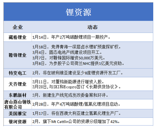 圖為2019年首季度全球主要材料企業(yè)在鋰資源方向的市場(chǎng)動(dòng)態(tài)
