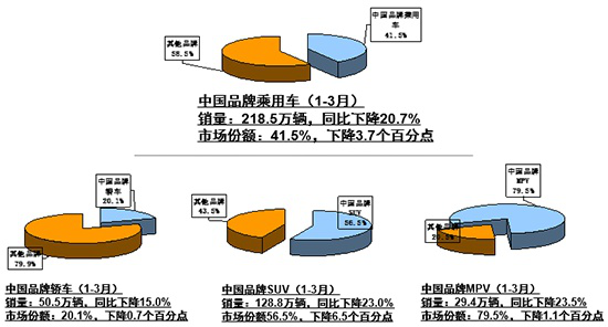 1-3月,自主品牌乘用車共銷售218.55萬輛,同比下降20.73%,占乘用車總銷量的41.53%,占有率同比下降3.67個百分點。其中,轎車共銷售50.5萬輛,同比下降15%,市場份額為20.1%,較去年同期下降0.7個百分點;SUV共銷售128.8萬輛,同比下降23%,市場份額為56.5%,下降6.5個百分點;MPV共銷售29.4萬輛,同比下降23.5%,市場份額為79.5%,下降1.1個百分點。