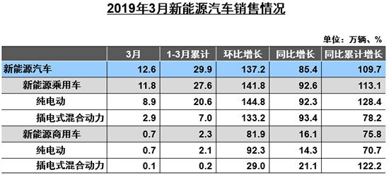3月,新能源汽車產(chǎn)銷分別完成12.8萬輛和12.6萬輛,比上年同期分別增長88.6%和85.4%,環(huán)比增長116.3%和137.2%;1-3月,新能源累計產(chǎn)銷分別完成30.4萬輛和29.9萬輛,同比分別增長102.7%和109.7%。