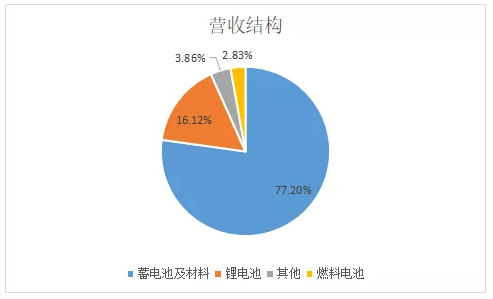 在營收結構中,鉛酸蓄電池仍然是營業(yè)收入的主要來源,營業(yè)收入為22.8億,營收占比為80.3%;鋰電池營業(yè)收入為4.8億,營收占比為16.8%。