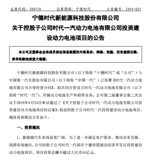 而為了進一步滿足新能源汽車市場客戶需求、推動業(yè)務(wù)發(fā)展、鞏固市場地位,公司控股子公司時代一汽擬在寧德市霞浦縣經(jīng)濟開發(fā)區(qū)投資建設(shè)動力電池項目,項目投資總額不超過人民幣44億元。建設(shè)期限36個月,用地面積約645畝(最終以實際用地面積為準(zhǔn))。