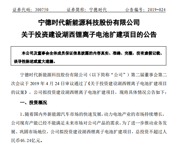 公告表示隨著國內(nèi)外新能源汽車市場的快速發(fā)展,動力電池產(chǎn)業(yè)的市場持續(xù)增長,寧德時代公司現(xiàn)有產(chǎn)能已經(jīng)不能滿足未來市場對公司產(chǎn)品的需求,為了進一步推動業(yè)務(wù)發(fā)展、鞏固市場地位,擬投資建設(shè)湖西鋰離子電池擴建項目,總投資不超過人民幣46.24億元。項目建設(shè)期約36個月。