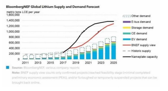 預(yù)計(jì)227463噸碳酸鋰當(dāng)量(LCE)的名義產(chǎn)能將在2019年投產(chǎn)。不過,自2018年第四季度以來,超過20萬噸碳酸鋰當(dāng)量的新鋰礦投資面臨延遲或是調(diào)低目標(biāo)。BNEF預(yù)測(cè),2019年全球鋰需求將同比上漲16.3%,達(dá)358096噸LCE。