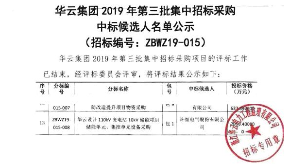 2019年4月1日,國(guó)網(wǎng)北京懷柔供電公司懷柔科學(xué)城10千伏可靠性提升工程(儲(chǔ)能一期)發(fā)布中標(biāo)公示。許繼電氣以3759萬(wàn)元投標(biāo)價(jià)格位列設(shè)備材料標(biāo)包第一中標(biāo)候選人。
