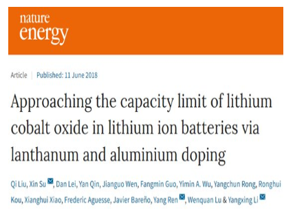 第二項(xiàng)成果:Approaching the capacity limit of lithium cobalt oxide in lithium ion batteries via lanthanum and aluminium doping(通過(guò)摻雜鑭和鋁,使鋰離子電池中的鈷酸鋰接近理論容量)。該成果是華為中央研究院聯(lián)合美國(guó)阿貢國(guó)家實(shí)驗(yàn)室通過(guò)摻雜La和Al,將LiCoO2的穩(wěn)定電壓提高到了4.5V,可逆容量達(dá)到190mAh/g。