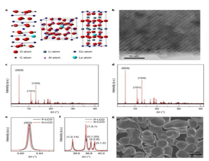 為此,華為中央研究院聯(lián)合美國(guó)阿貢國(guó)家實(shí)驗(yàn)室通過(guò)La和Al摻雜,將LiCoO2的穩(wěn)定電壓提高到了4.5V,可逆容量達(dá)到190mAh/g,其中La能夠增加LCO材料在c軸方向上的晶胞參數(shù),Al則能夠起到促進(jìn)Li+擴(kuò)散、穩(wěn)定晶體結(jié)構(gòu)和防止LCO材料相變的作用,兩者相互作用顯著改善了LCO材料在高電壓下的結(jié)構(gòu)穩(wěn)定性,循環(huán)50次后仍然能夠保持96%的容量,并使得LCO材料的倍率性能得到了大幅提高。