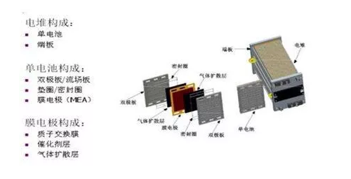 因此燃料電池電堆從組成上分為單電池和端板,單電池由雙極板、墊圈/密封圈和膜電極組成(MEA),膜電極又由質子交換膜、催化劑層和氣體擴散層組成,其中膜電極(MEA)是燃料電池中最為核心的環(huán)節(jié)。