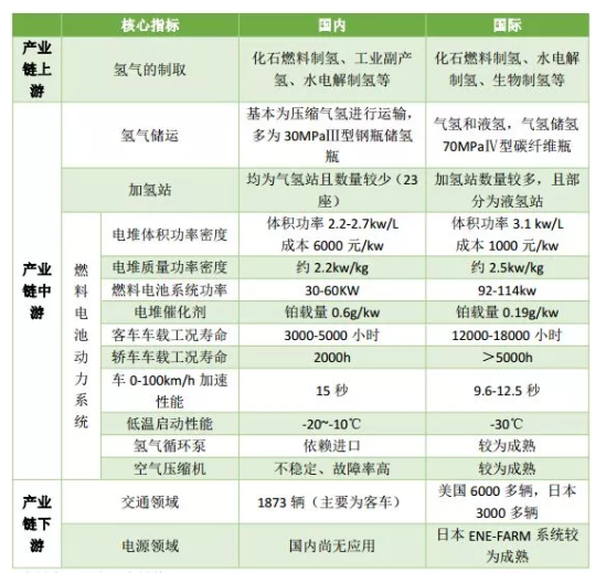 我國與國外在氫燃料電池產業(yè)方面總體來說還是有很大的差距,下表為國內外氫燃料電池產業(yè)核心指標的對比,并在后半部分對各個指標進行了簡要說明。