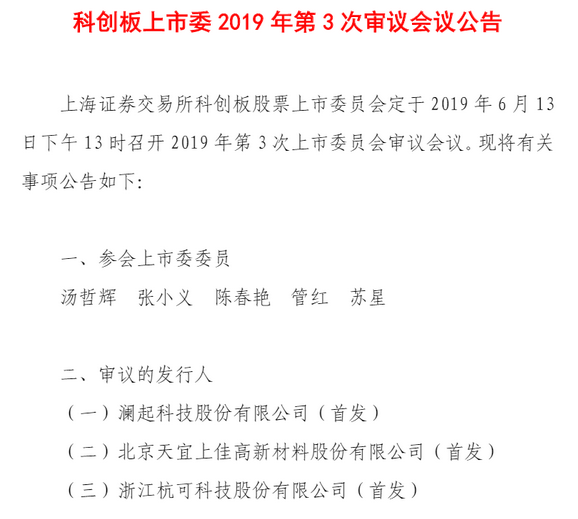 6月3日,上交所網(wǎng)站發(fā)布消息,上交所科創(chuàng)板股票上市委員會(huì)定于2019年6月13日下午13時(shí)召開2019年第3次上市委審議會(huì)議。瀾起科技、天宜上佳、杭可科技三家科創(chuàng)板擬上市企業(yè)將上會(huì)。