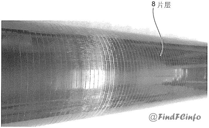 通過展示本卷繞工序形成的片層的外觀圖,可明顯看出,通過多步分割卷繞工序能夠有效地使片狀纖維均勻?qū)盈B,防止在片層表面產(chǎn)生橫穿分割片狀纖維卷繞方向的褶皺等缺陷。